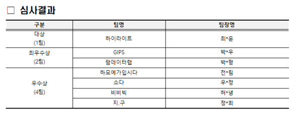 빅데이터로 우리동네 문제해결 아이디어 공모대회 최종 심사 결과 안내 페이지 정보 작성자 관리자 작성일 25-12-24 13:12 조회수 120회 목록 본문 빅데이터로 우리동네 문제해결 아이디어 공모대회 최종 심사 결과를 위와 같이 안내 드립니다.※ 수상팀은 시상식 참여를 위한 별도 연락 예정문의사항: 055-772-4710 목록