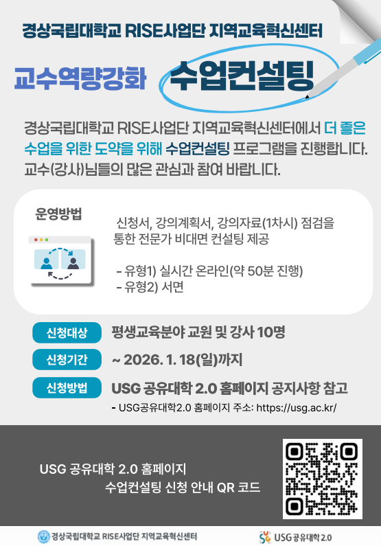 경상국립대학교 RISE사업단 지역교육혁신센터에서는 평생교육분야 맞춤형 수업 컨설팅 프로그램을 운영하오니 많은 관심과 신청 바랍니다.